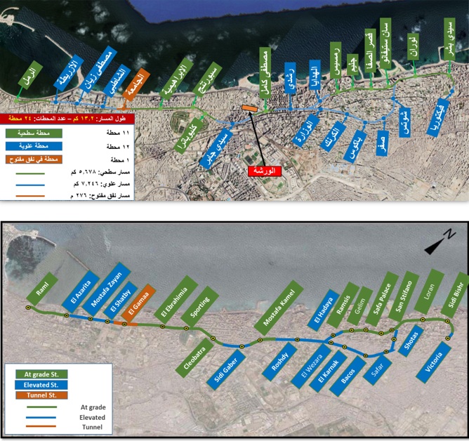 After rehabilitation, it extends for a length of 13.2 km with 24 stations (12) elevated - 11 surface - 1 station in an open tunnel) from Victoria, then it extends west to pass through the areas of San Stefano, Gianaclis, Rushdi, Mustafa Kamel, Sidi Gaber and Sporting, ending in Raml.