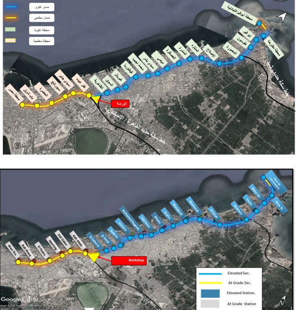 - يمتد بطول ۲۱.۷ كم بعدد ۲۰ محطة ( ١٤) علوية - ٦ سطحية ) من أبو قير مرورا بسيدي جابر وفيكتوريا وسيدي بشر والمنتزه وصولا لمحطة مصر بالإسكندرية.