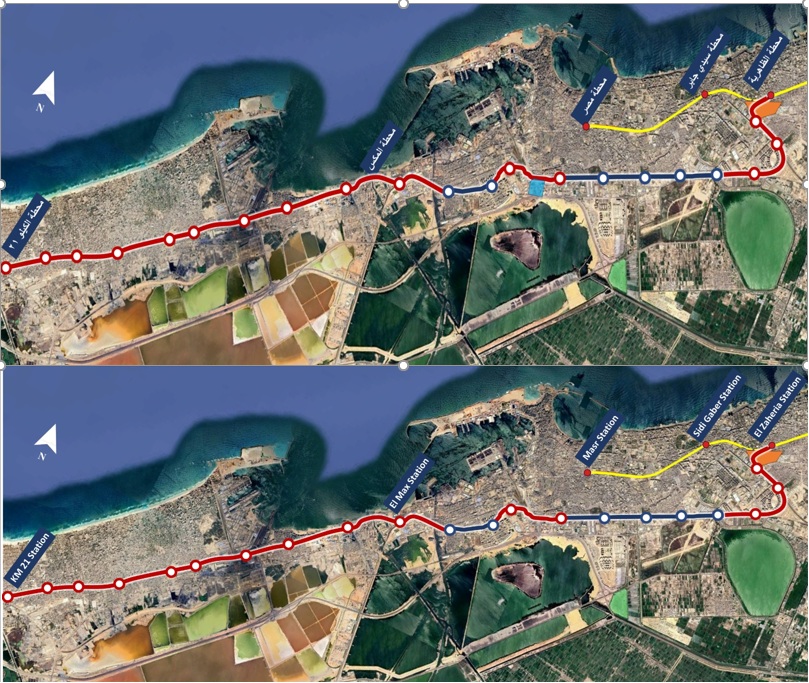المرحلة الثانية من مترو الاسكندرية والذي يمتد من بعد محطة الظاهرية حتى الكيلومتر 21 عبر طريق الإسكندرية/مطروح بطول إجمالي 31 كم (من بعد محطة الظاهرية في مسار علوي ثم في مسار سطحي وعلوي ضمن حرم السكة الحديد حتى يصل إلى محطة المكس ، ثم يمتد في مسار علوي حتى الكيلومتر 21 عبر طريق الإسكندرية/مطروح) بعدد 21 محطة (6 سطحية ، 15 علوية) ،