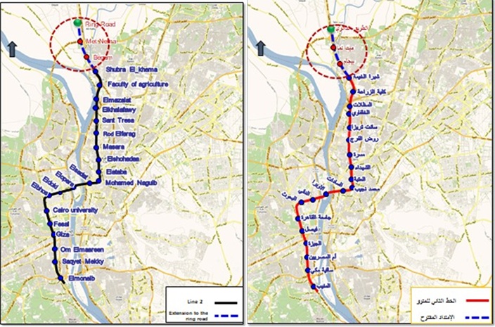 سيتم مد الخط الثانى للمترو من بعد محطة شبرا الخيمة بطول 3.2 كم وعدد 3 محطات ليصل إلى الطريق الدائري لتحقيق تبادل الخدمة مع الأتوبيس الترددى BRT.